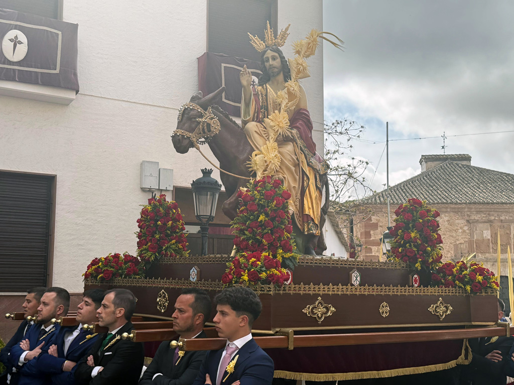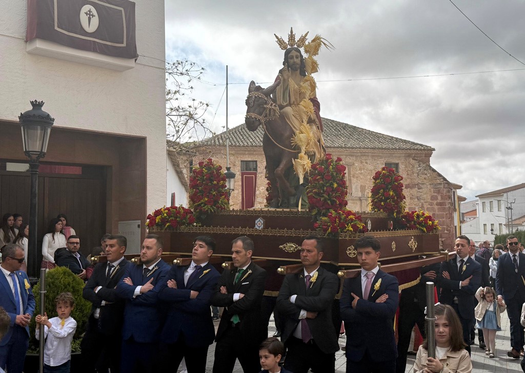 Portada en hombros por la cuadrilla de anderos que lleva su nombre, ‘La Borriquilla’ llegaba a la Iglesia Parroquial acompañada por numerosos vecinos, miembros de las distintas cofradías de pasión y una gran representación de niños y jóvenes pertenecientes a los grupos de catequesis. El ambiente festivo y de recogimiento marcó el inicio de una de las semanas más significativas para la localidad.