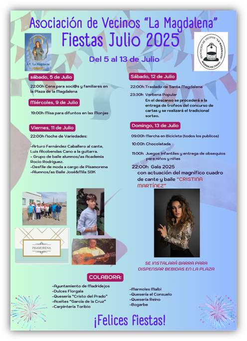 Desde la Asociación de Vecinos de «La Magdalena» invitan a todos los madridejenses a sumarse a un fin de semana que promete emociones, convivencia y mucho sentimiento por las tradiciones del barrio.