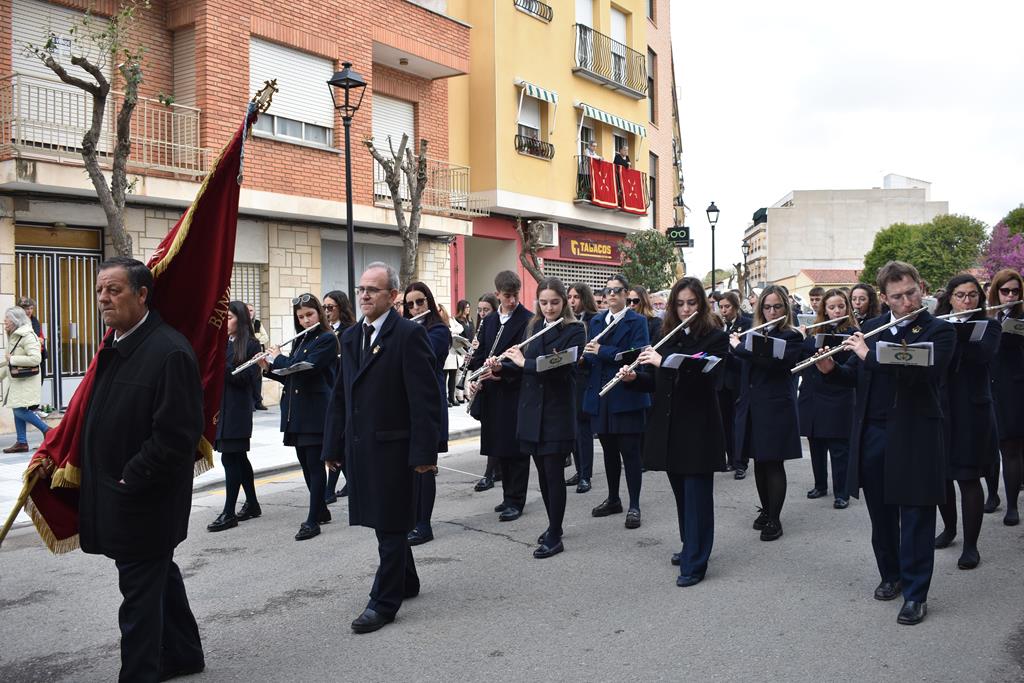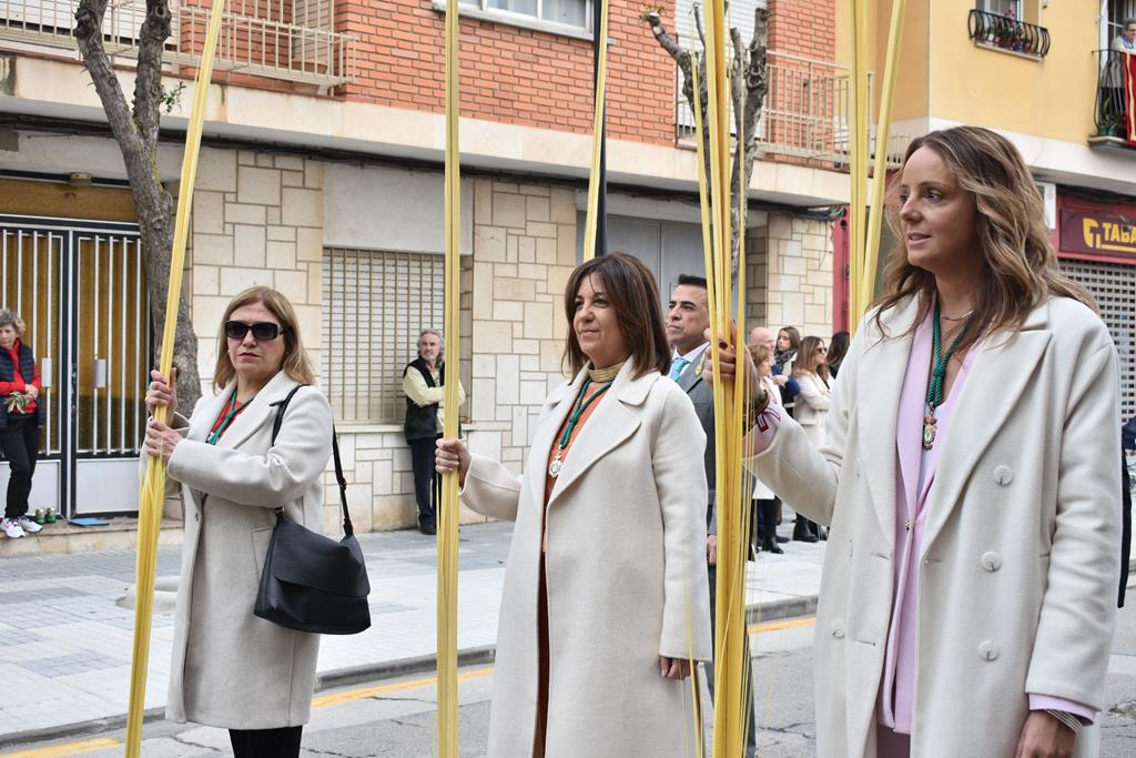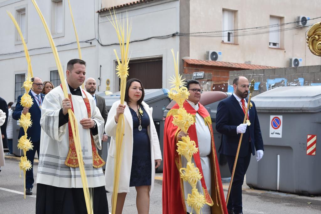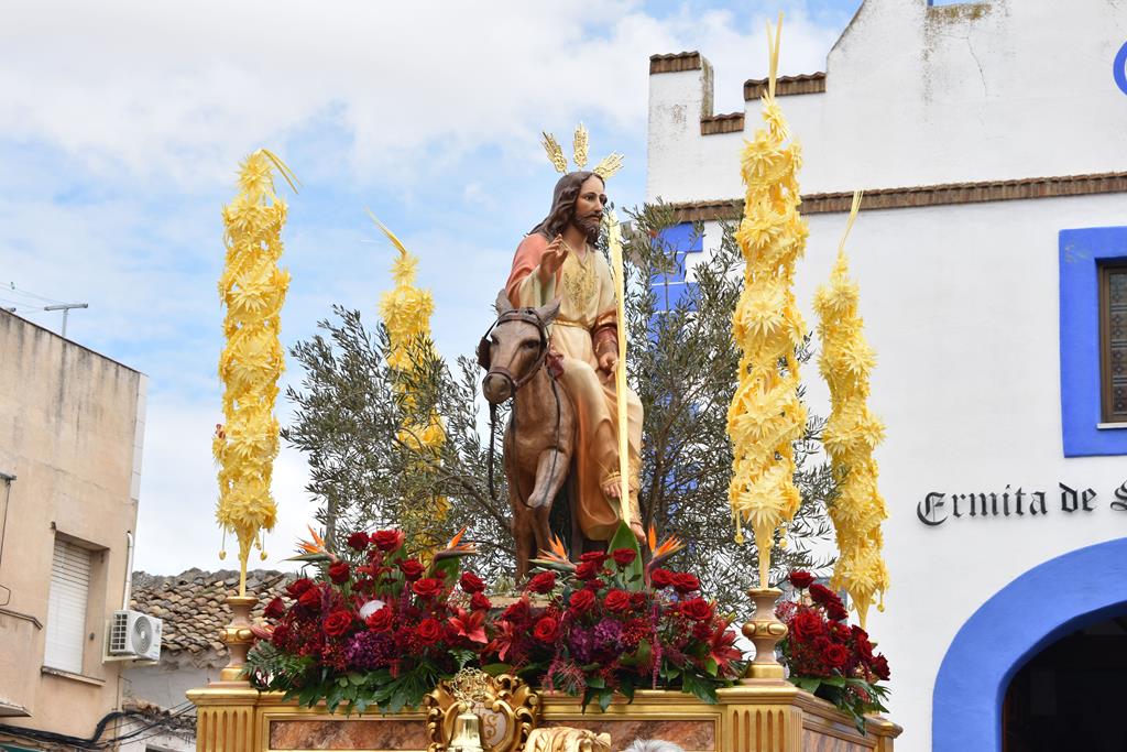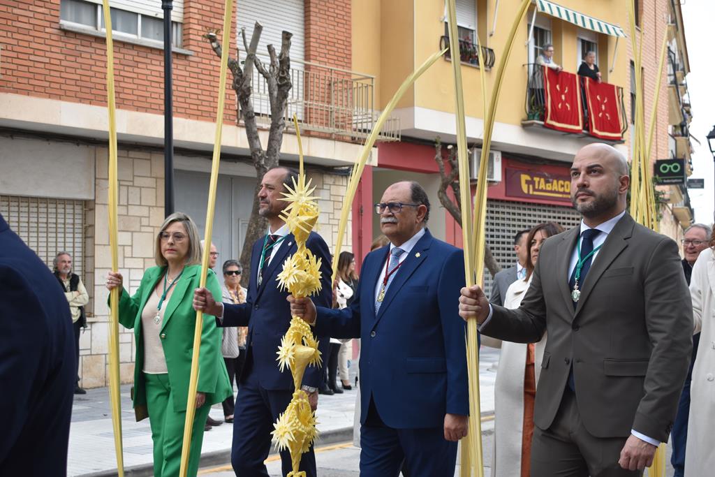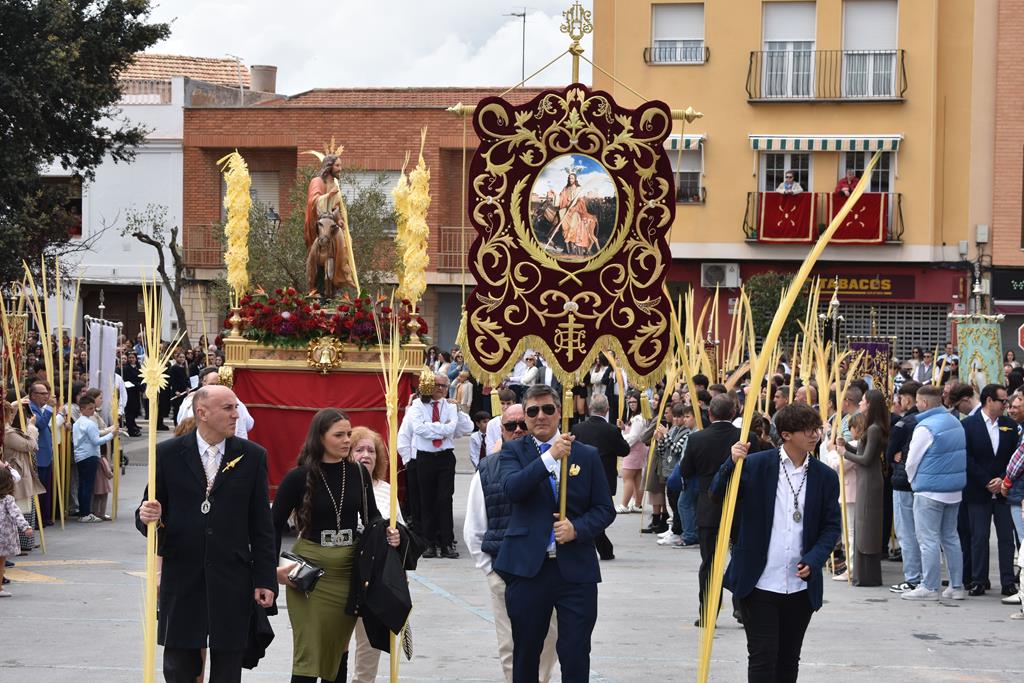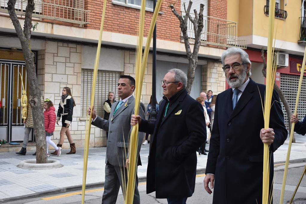 Encabezado por el estandarte de la Junta de Cofradías de Semana Santa, el cortejo procesional recorrió las calles de la localidad con la participación de los estandartes de todas las hermandades, seguido del Paso de la Borriquilla, las autoridades religiosas, civiles y militares, y la Banda Sinfónica Municipal, dirigida por D. Sebastián Heras Romero, que aportó el acompañamiento musical solemne y festivo.