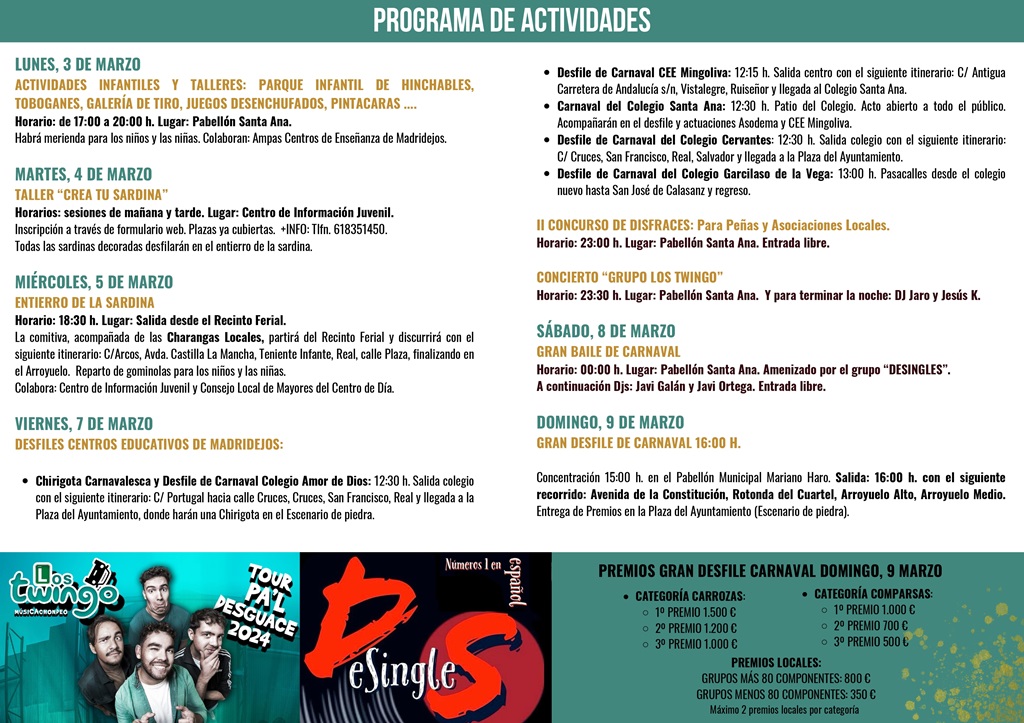 El Carnaval de Madridejos arranca el próximo lunes 3 de marzo con un programa repleto de actividades para todas las edades. Durante toda la semana, el municipio se vestirá de gala con desfiles, concursos, talleres y mucha música para celebrar esta tradición con más fuerza que nunca.