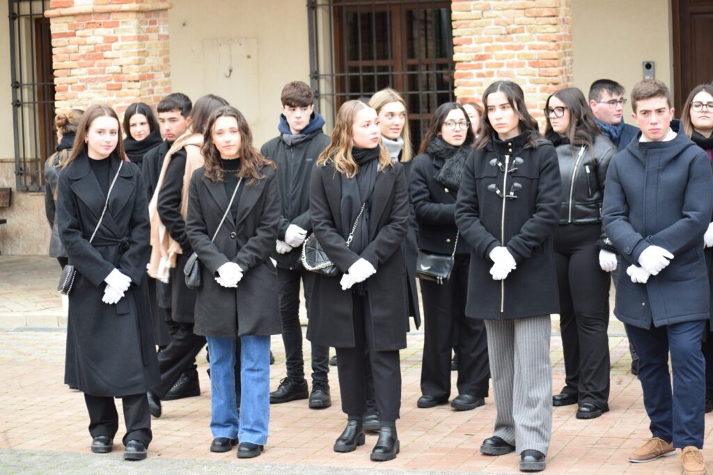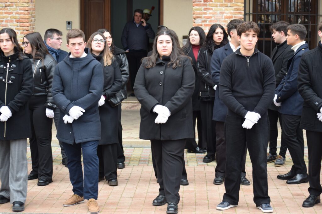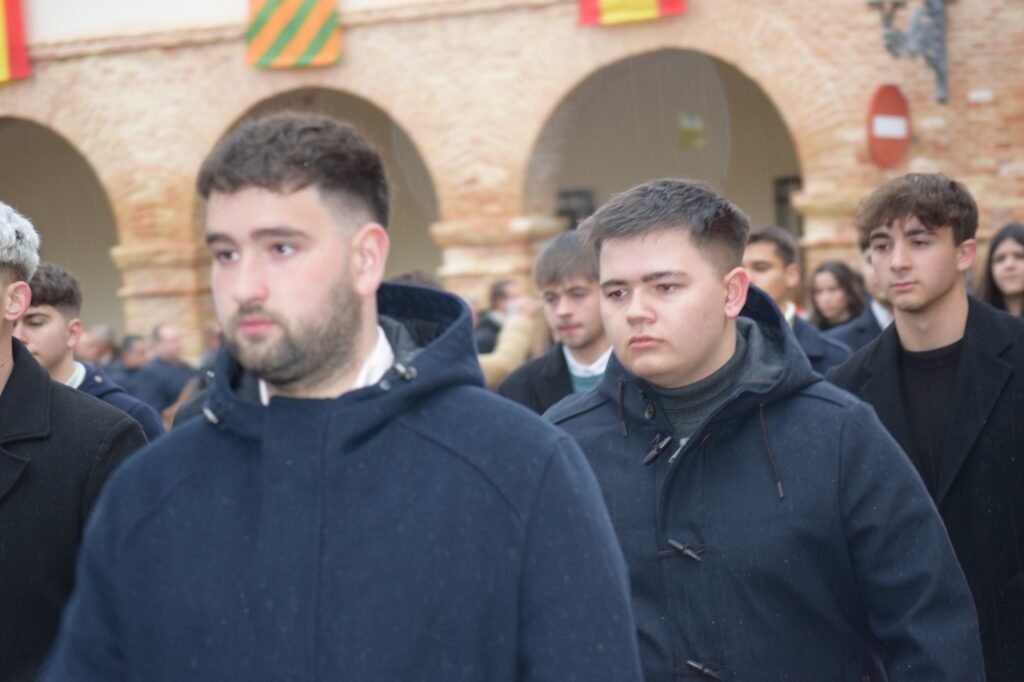 A las 10 de la mañana en la Plaza del Ayuntamiento, y a pesar de la fina lluvia que caía sobre la localidad, se han congregado los portadores del Santo, siendo dos quintas de hombres y mujeres, una quinta de veteranos y la quinta que por edad le correspondería el Servicio Militar.