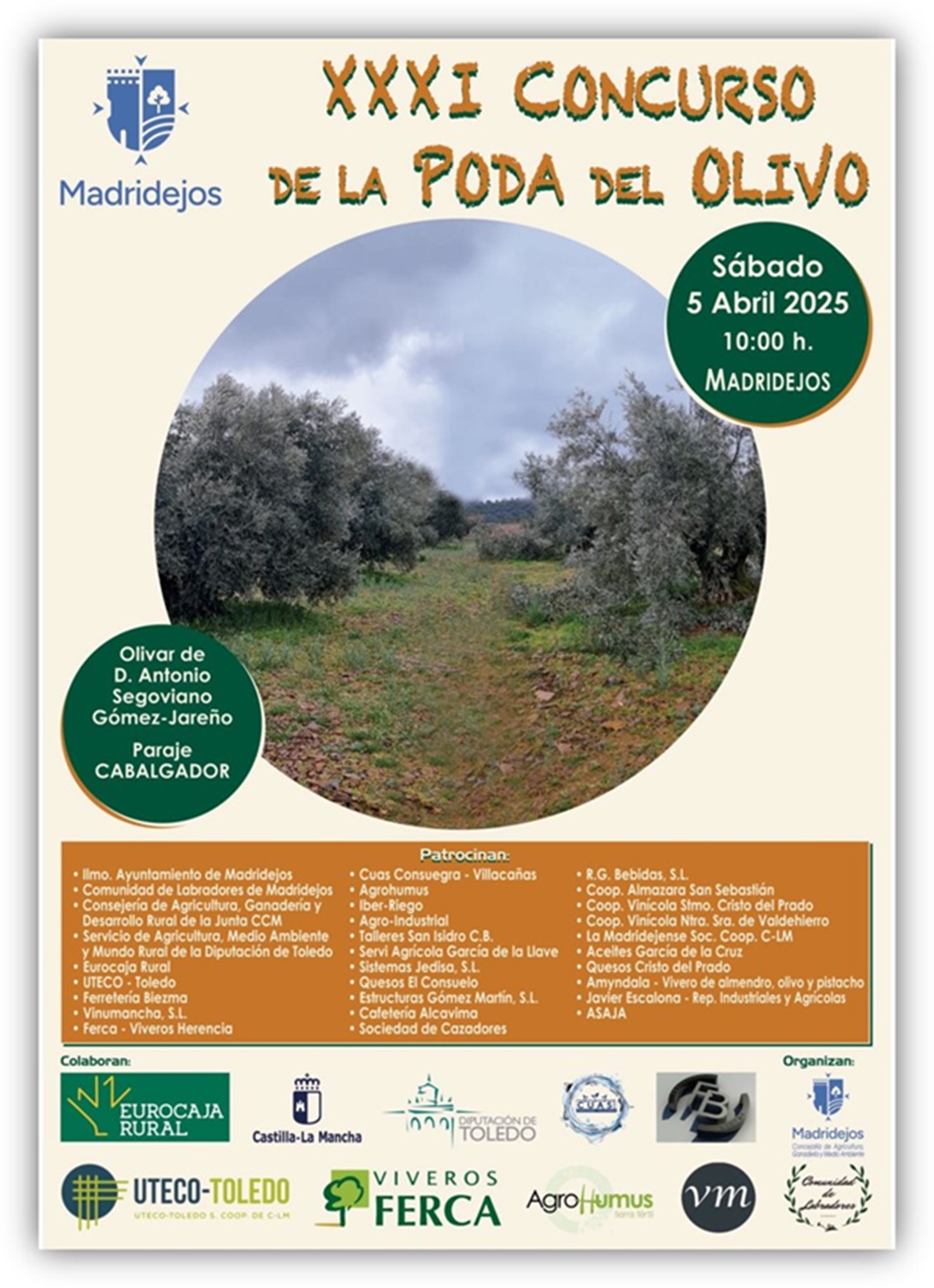 El próximo 5 de abril, la localidad toledana de Madridejos será el escenario del XXXI Concurso de la Poda del Olivo. La cita tendrá lugar a las 10:00 horas en el olivar de D. Antonio Segoviano Gómez-Jareño, ubicado en el Paraje Cabalgador. Este evento anual es una tradición que reúne a los mejores expertos en el arte de la poda de olivos, con la posibilidad de obtener premios y trofeos hasta el 18º puesto.