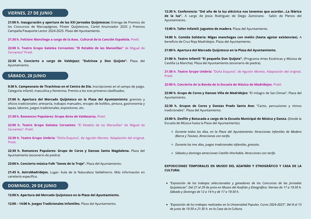 El Ilmo. Ayuntamiento de Madridejos ha presentado la programación oficial de las Jornadas Quijotescas, una cita imprescindible en el calendario cultural del municipio, que este año se celebrará del 28 al 30 de junio.