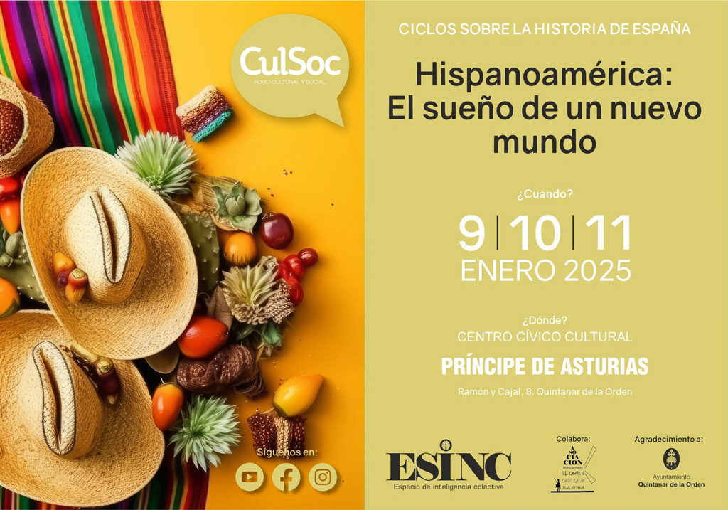 El Foro Cultural y Social ‘CulSoc‘ comienza este año 2025 con la mirada puesta en Hispanoamérica y en sus países hermanos de España. Para ello, y dentro de lo que se ha denominado «Ciclos sobre la historia de España», ha organizado las primeras jornadas sobre Hispanoamérica de Quintanar de la Orden tituladas ‘Hispanoamérica: El sueño de un nuevo mundo’.