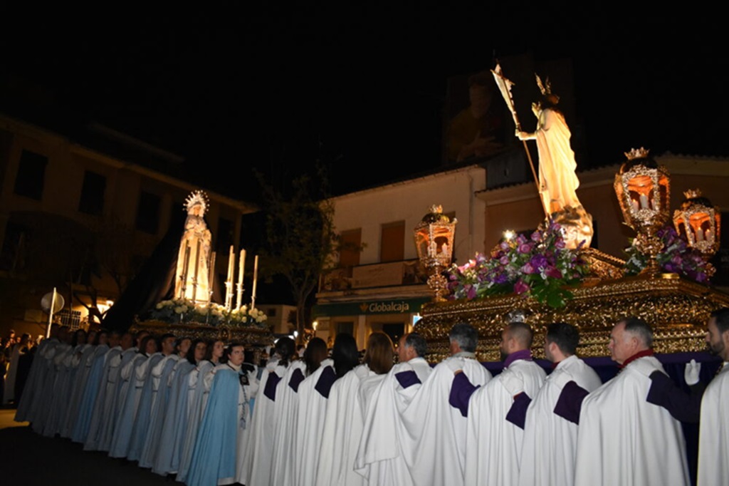 Durante la madrugada de este sábado 19 de abril se ha celebrado en Quintanar de la Orden la Procesión del Encuentro de Jesús Resucitado con su Madre la Virgen Dolorosa, como broche final de las Procesiones de la Semana Santa Quintanareña, declarada de Interés Turístico Regional.