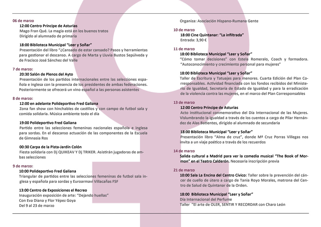 Por su parte, Natalia Sánchez-Flor, concejala de Deportes, ha detallado las actividades deportivas programadas para el fin de semana del 8 y 9 de marzo, destacando el partido amistoso que disputarán, el 8 de marzo, las selecciones de fútbol sala femenina de España e Inglaterra a beneficio de personas con discapacidad auditiva. El encuentro, que se disputará en el recién inaugurado Pabellón Fred Galiana, tiene un carácter solidario, ya que los beneficios recaudados se destinarán íntegramente a la Selección Española, que necesita fondos para su participación en el Mundial de Italia.