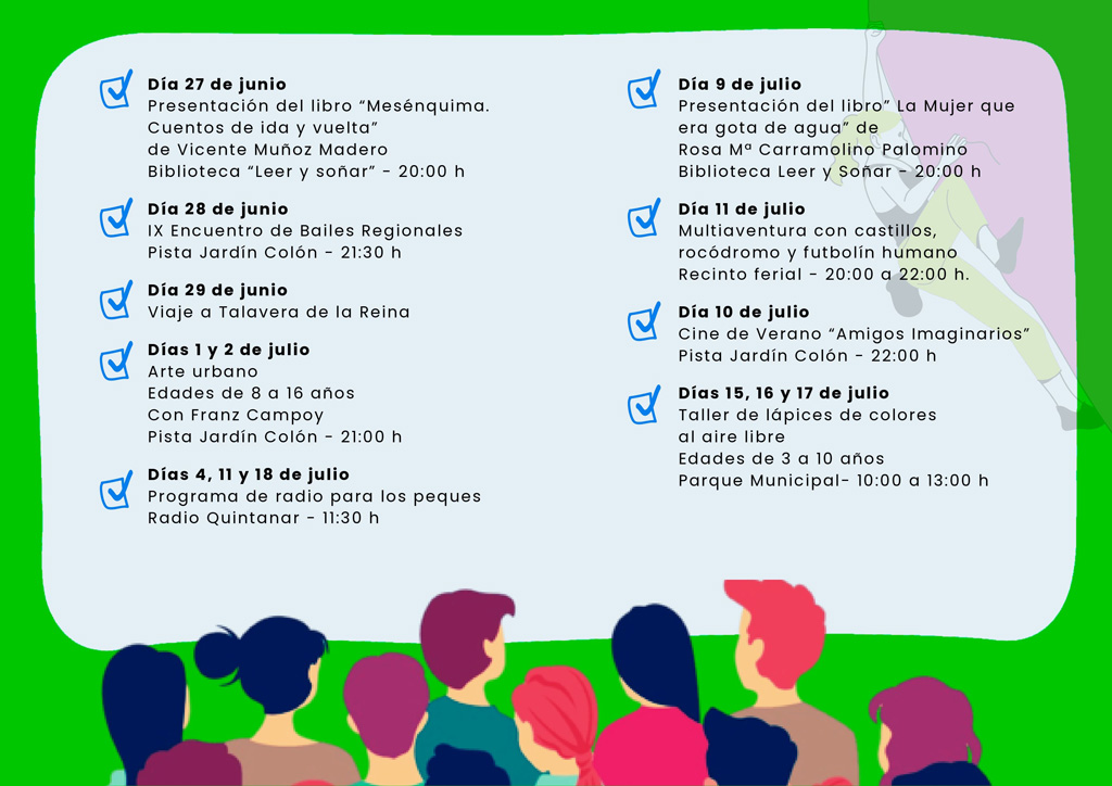 El acto ha estado presidido por la concejala de Cultura, M.ª Carmen Vallejo, quien ha agradecido la colaboración de la Concejalía de Familia en la elaboración del programa, destacando el esfuerzo conjunto para ofrecer una programación “cargada de propuestas que invitan a vivir la cultura durante el caluroso mes de julio”. Vallejo también ha extendido una invitación a los vecinos de municipios cercanos a sumarse a las actividades que ofrece Quintanar este verano.